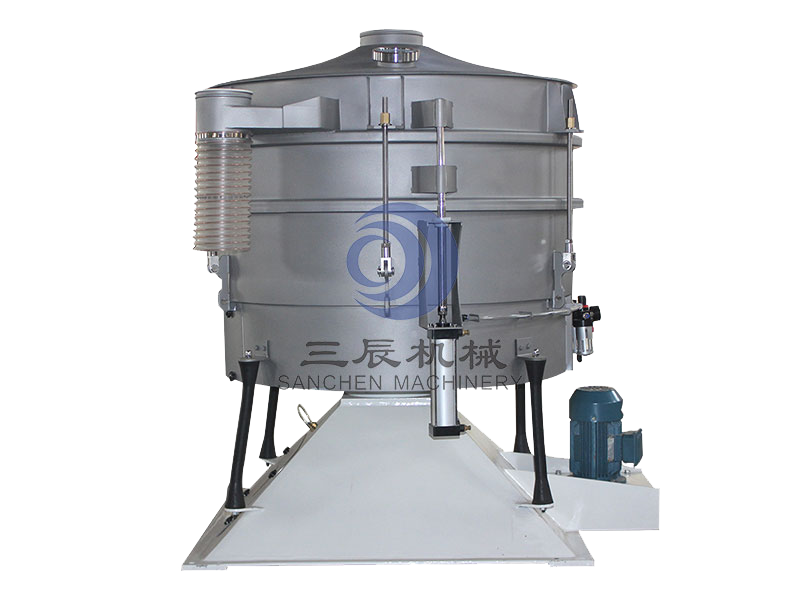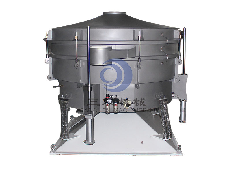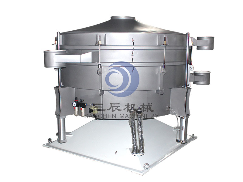 From the point of view of the running track,the swing screen is a kind of nonlinear inertia vibrating screen,and the basic rotary operation is similar to that of the artificial screen.The eccentricity is adjustable from 25 to 40mm,and the low speed V belt drive is adjustable from 120 to 360rpm.The residence time of each product can be adjusted by the radial and tangent angle of the swing screen to the driving axis direction.Therefore,the horizontal and throwing three dimensional roll motion is established. The material is distributed evenly across the screen from the center to the outer edge,and then propagates in the axial direction by the spiral motion.Fine particles thus complete the whole screening process.The horizontal and vertical acceleration increases with the particle movement,close to the aperture size of particles with successful separation;larger particles were transported to the outlet,the outlet has an adjustable guiding device to control the flow,the guiding device is another factor to control the residence time of materials.This process is repeated between each sifting layer.